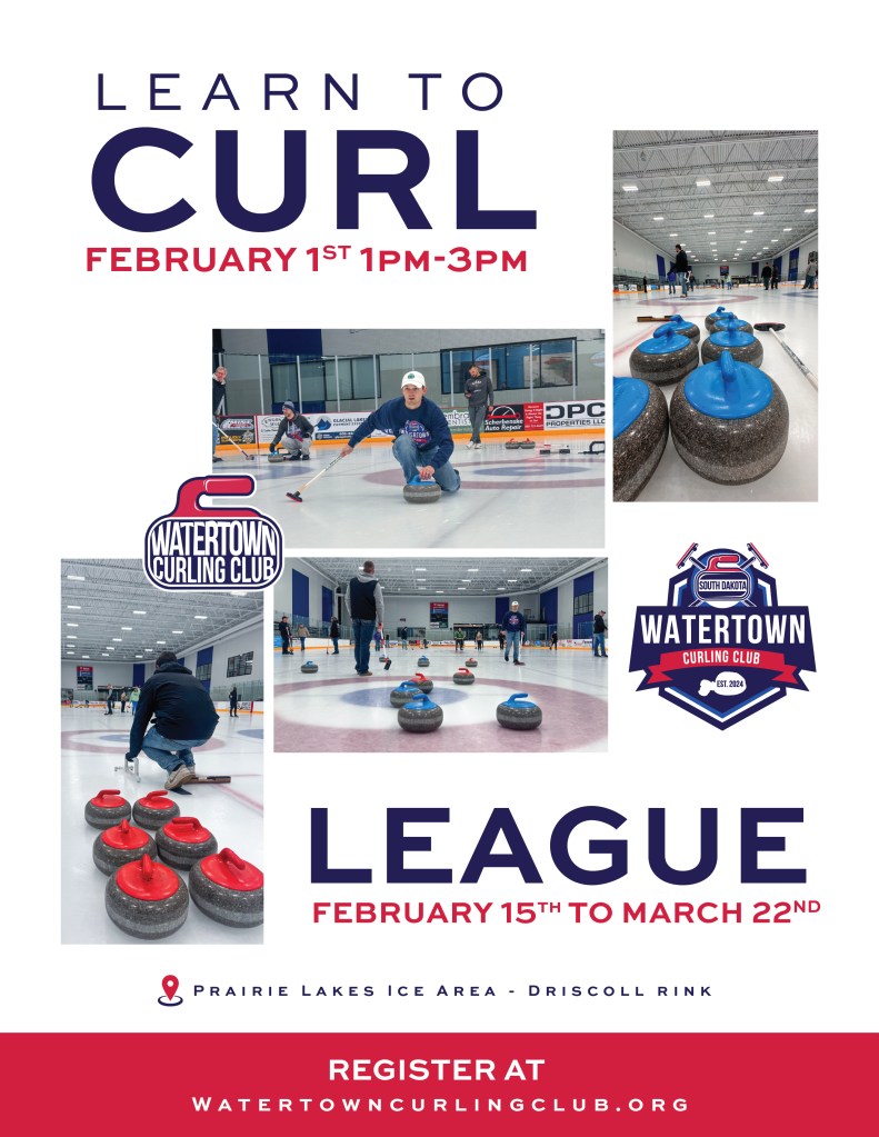 The Watertown Curling Club will be hosting a Learn to Curl event on Sunday, February 1, 2026, from 1:00–3:00 PM at the Prairie Lakes Ice Arena (Driscoll Rink).